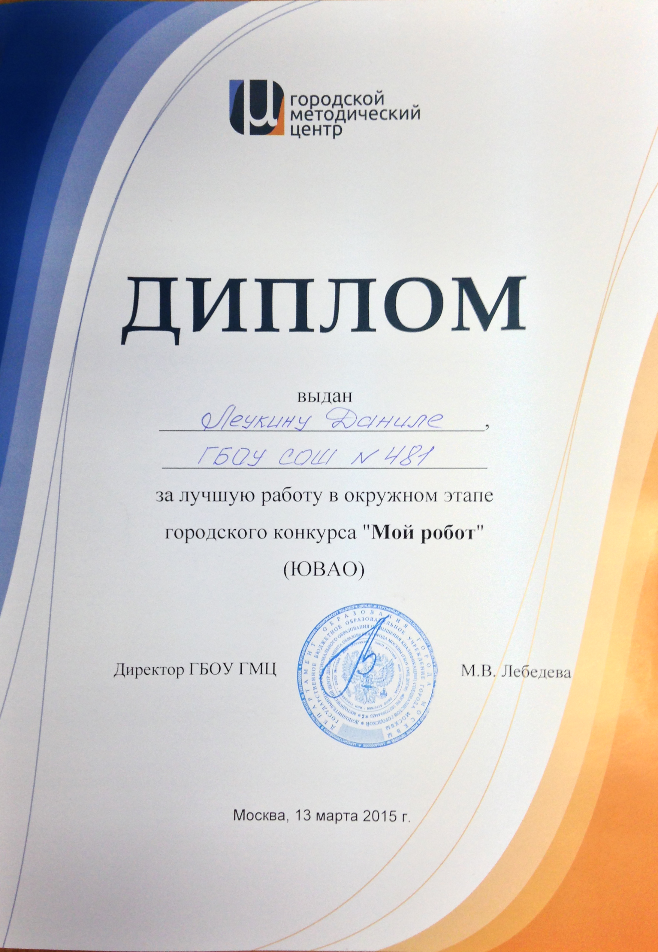 1) Диплом за лучшую работу в окружном этапе городского конкурса “Мой робот”, ГМЦ, г. Москва, 2015 г. (доступно по ссылке)