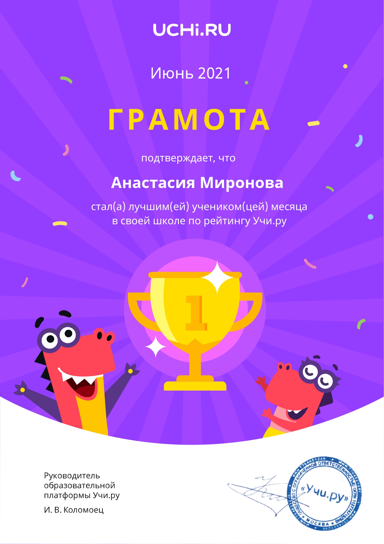 13) Грамота лучшего ученика месяца в своей школе по рейтингу УЧИ.РУ, г. Москва, 2021 г. (доступно по ссылке)