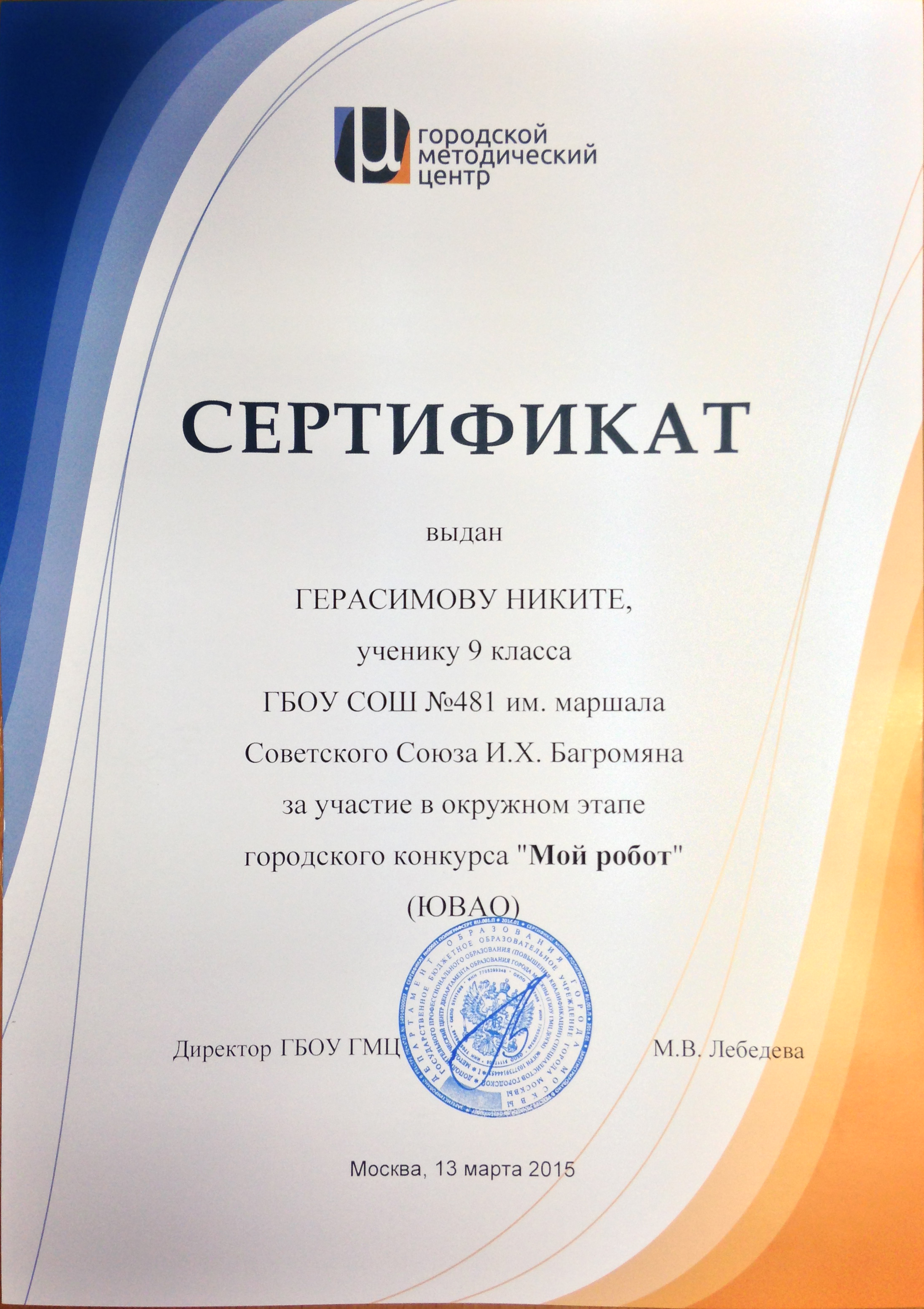 3) Сертификат участника окружного этапа городского конкурса “Мой робот”, ГМЦ, г. Москва, 2015 г. (доступно по ссылке)
