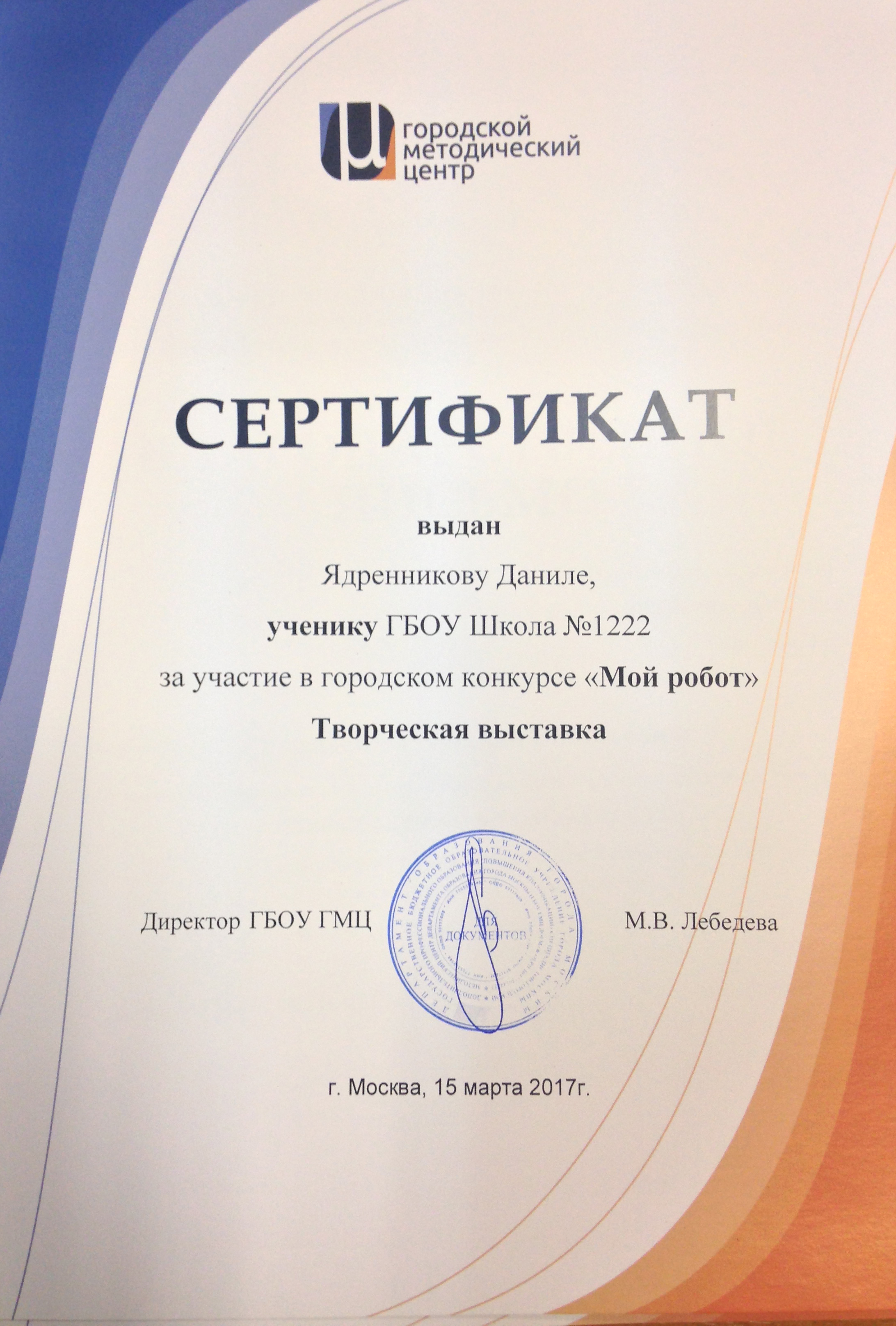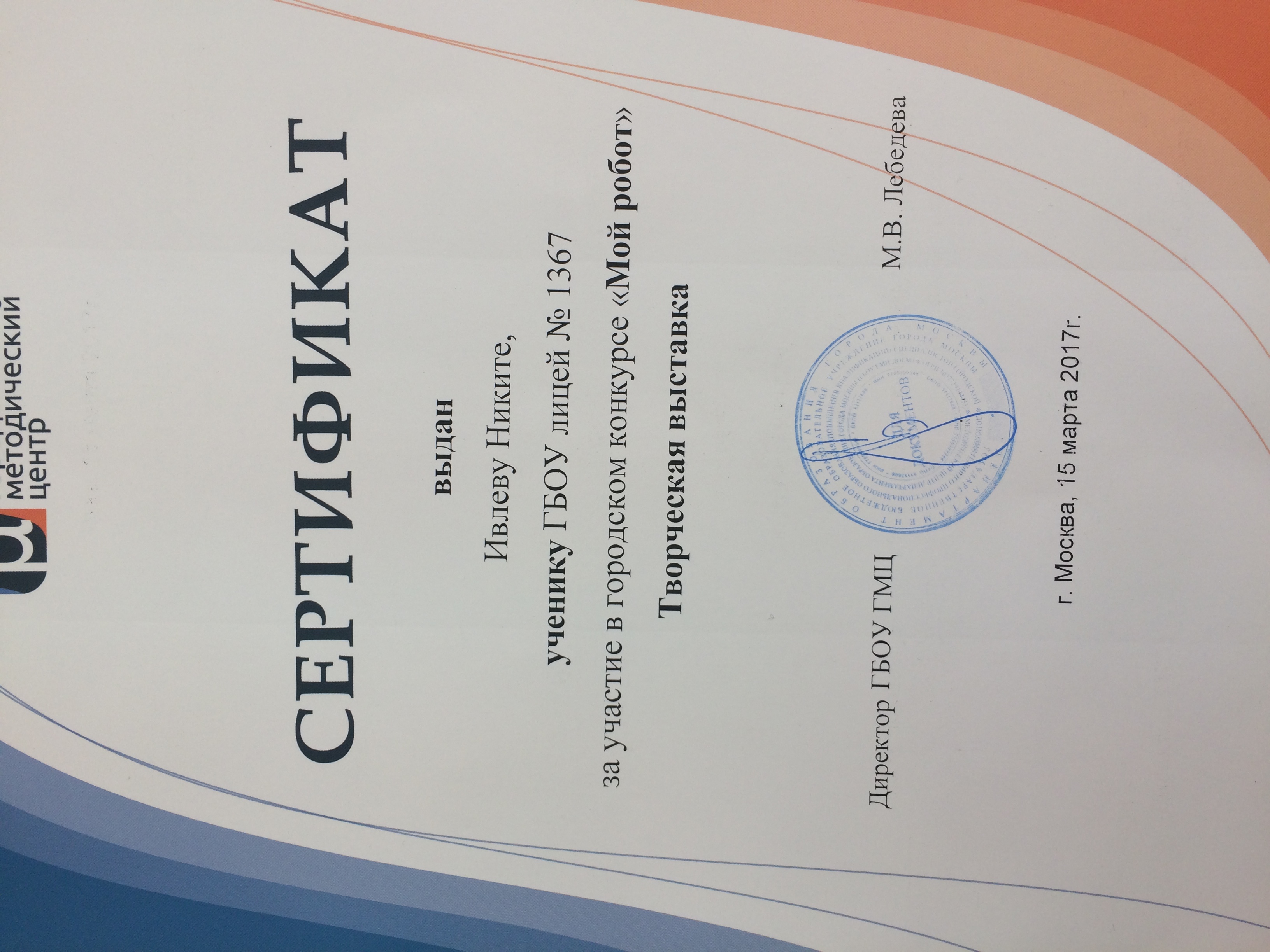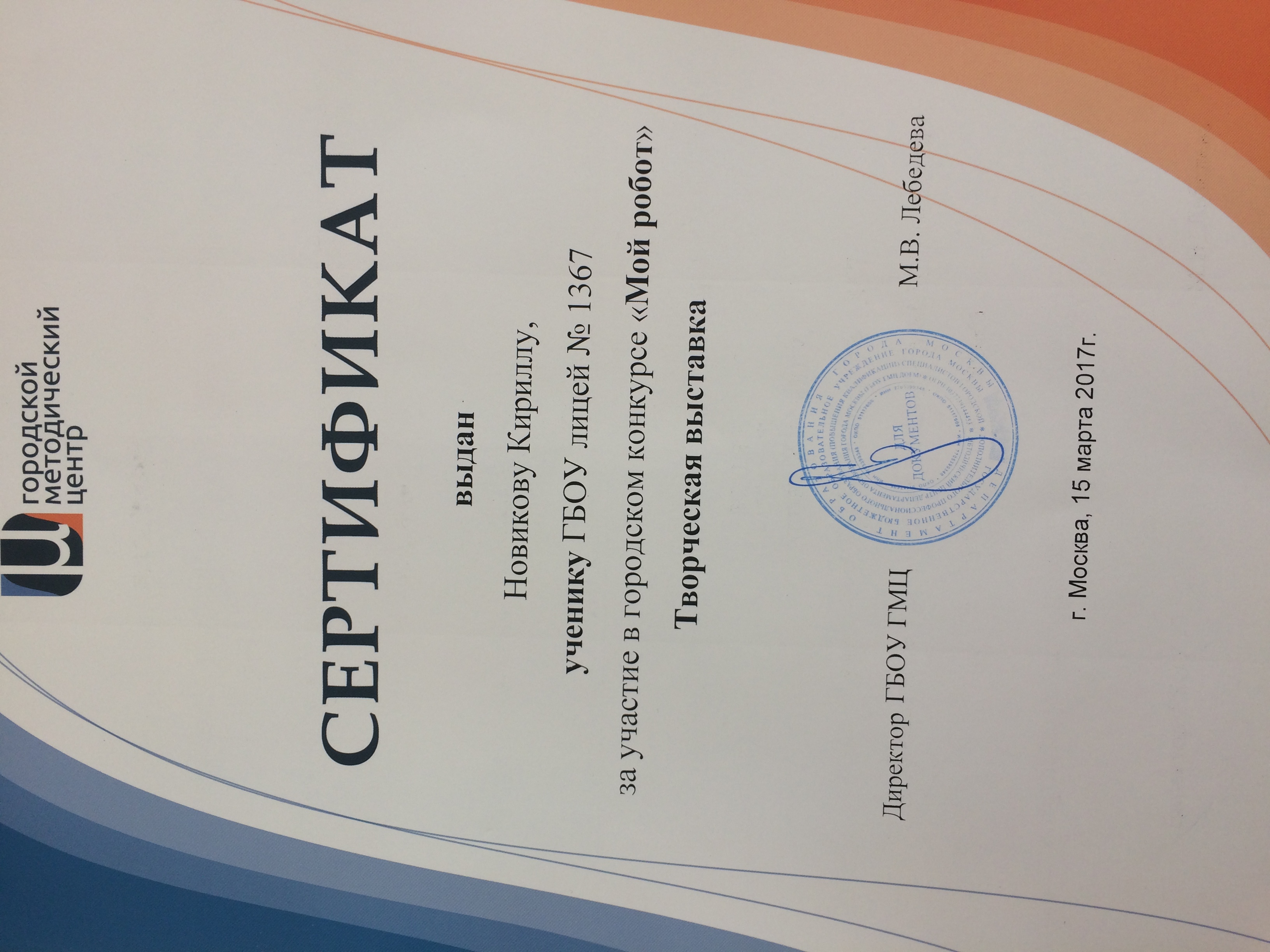 4) Сертификат участника творческой выставки в городском конкурсе “Мой робот”, ГМЦ, г. Москва, 2017 г. (ссылка 1 ссылка 2 ссылка 3)