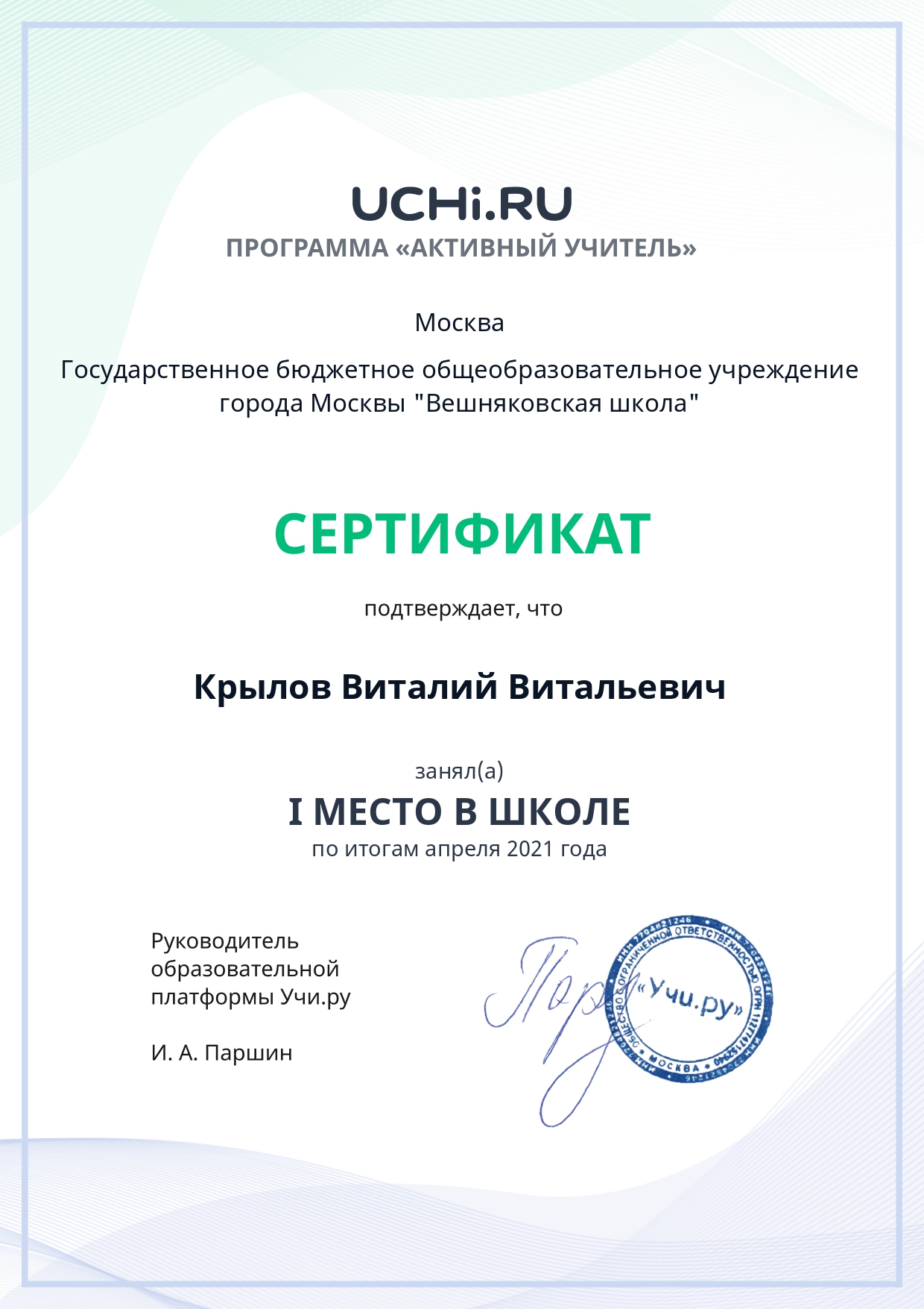 6) Сертификат за I место в школе в апреле 2021 г. в рамках программы "Активный учитель", УЧИ.РУ, г. Москва, 2021 г. (доступно по ссылке)