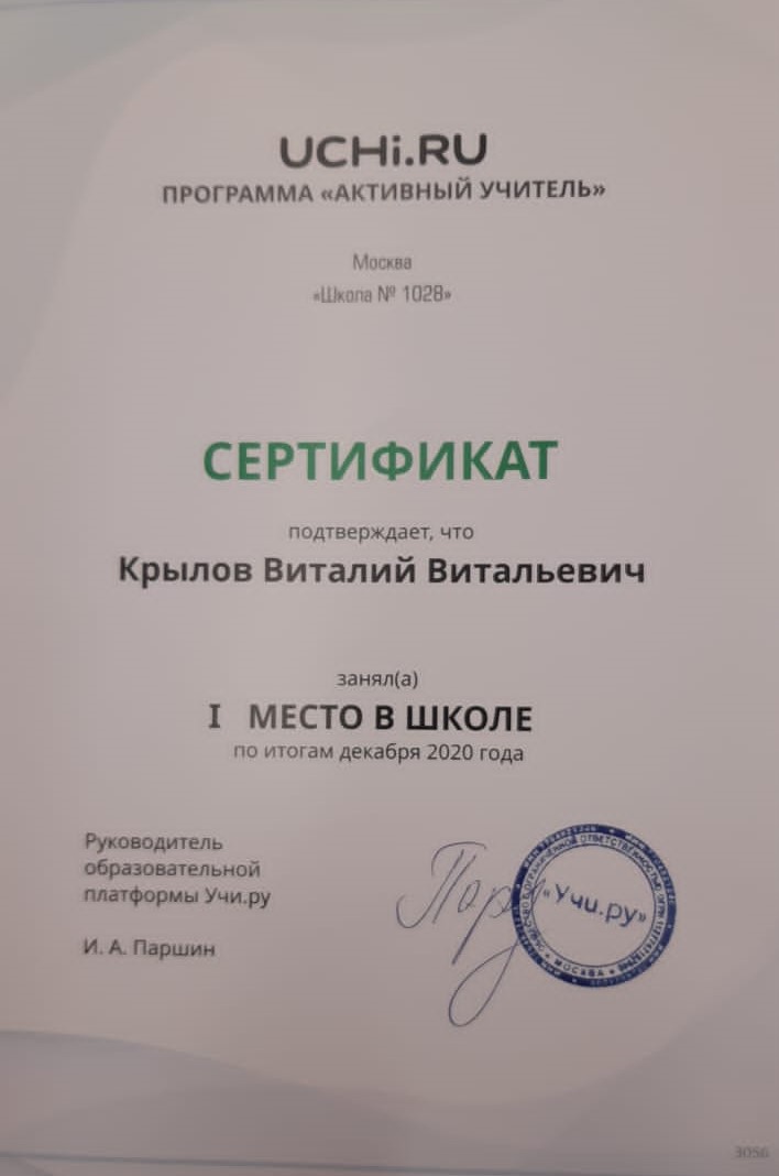5) Сертификат за I место в школе в декабре 2020 г. в рамках программы "Активный учитель", УЧИ.РУ, г. Москва, 2020 г. (доступно по ссылке)