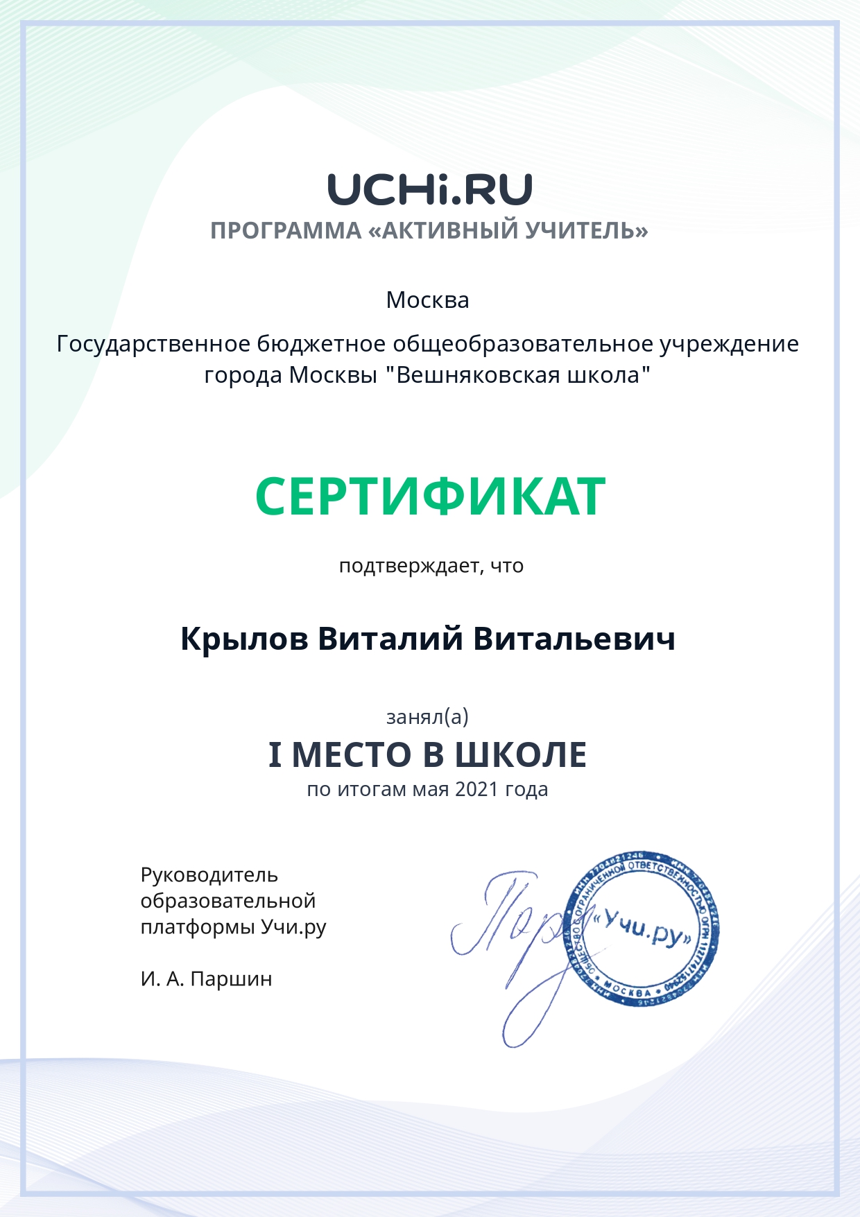 7) Сертификат за I место в школе в мае 2021 г. в рамках программы "Активный учитель", УЧИ.РУ, г. Москва, 2021 г. (доступно по ссылке)
