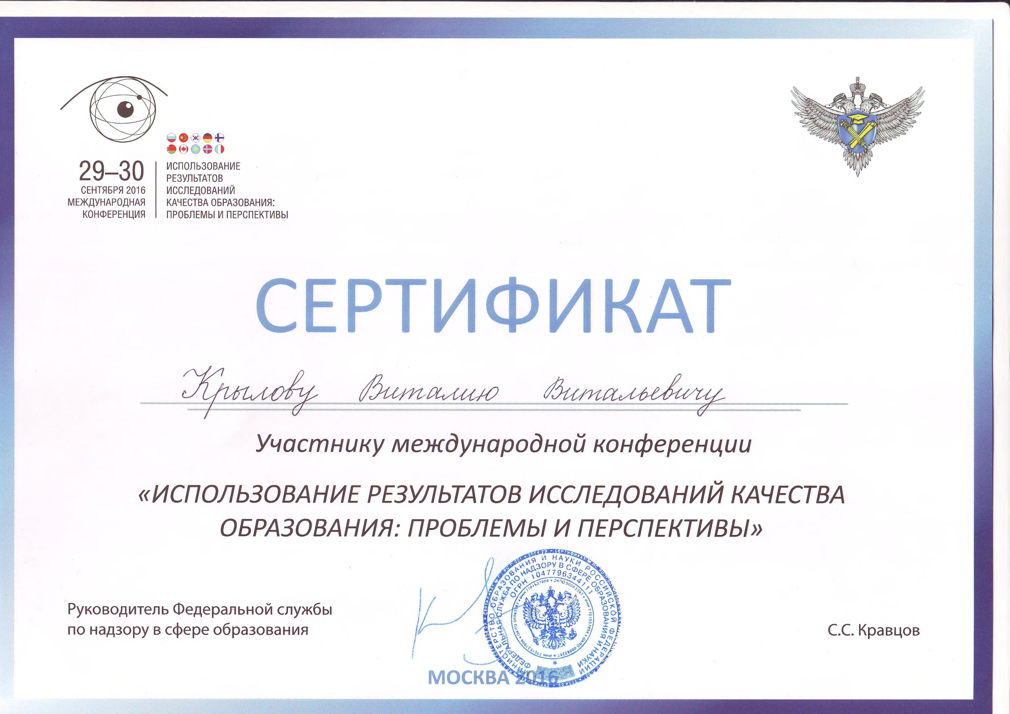 1) Сертификат участника международной конференции “Использование результатов исследований качества образования: проблемы и перспективы’, Рособрнадзор, г. Москва, 2016 г. (доступно по ссылке)