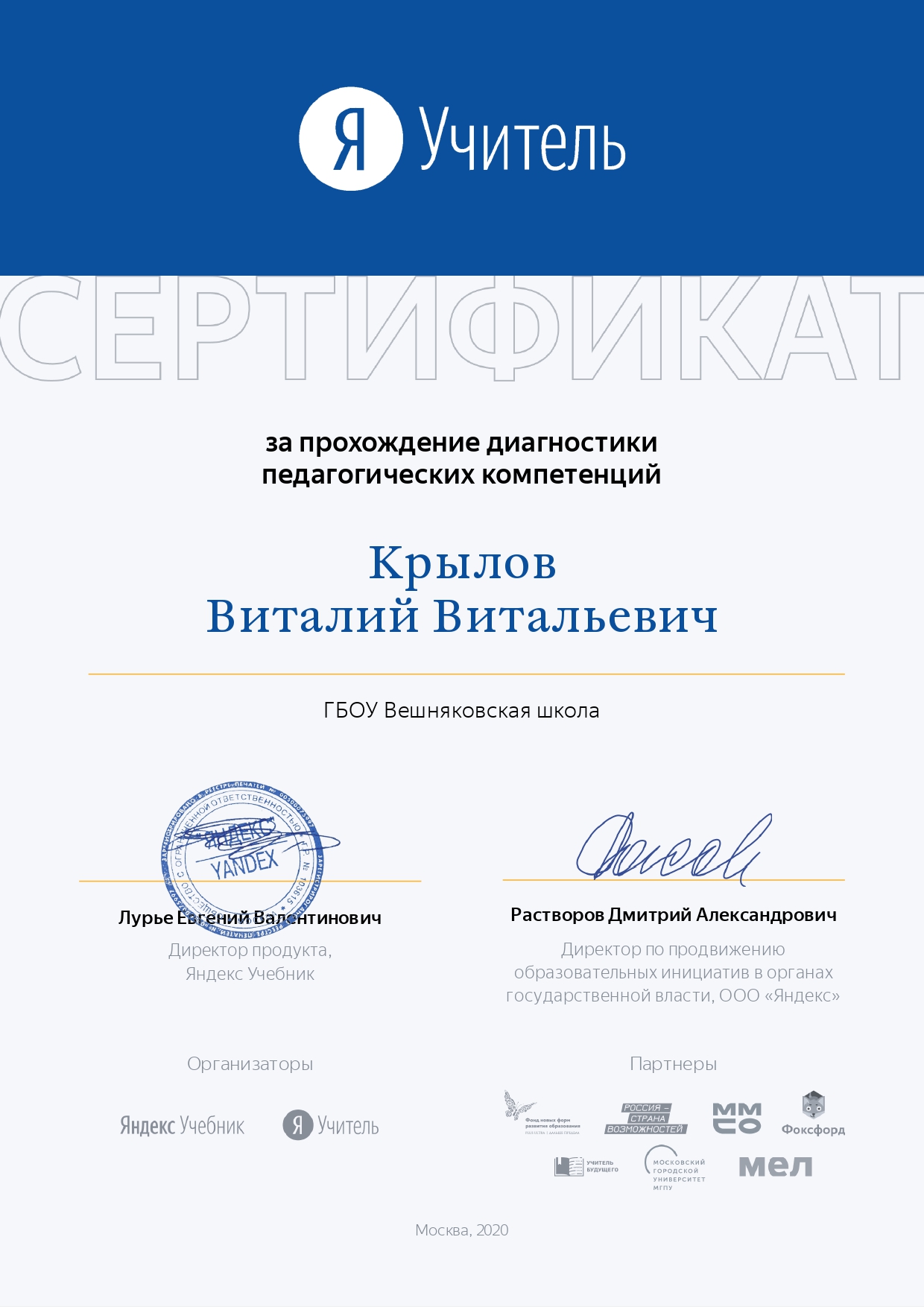 4) Сертификат за прохождение диагностики педагогических компетенций, Яндекс, г. Москва, 2020 г. (доступно по ссылке)